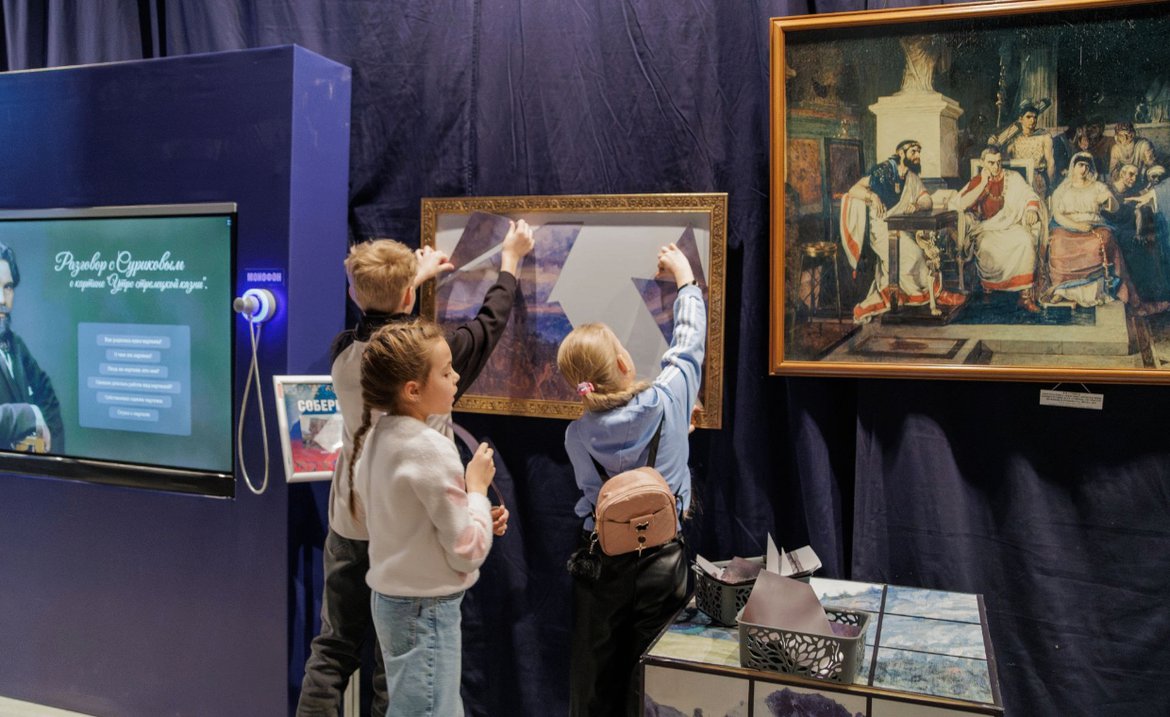 На сенсорном экране попробуйте отличить, чем произведения Сурикова выделяются среди работ других художников. Вы окажетесь среди сцен народных битв, драматических исторических событий и портретов ярких героев той эпохи.
